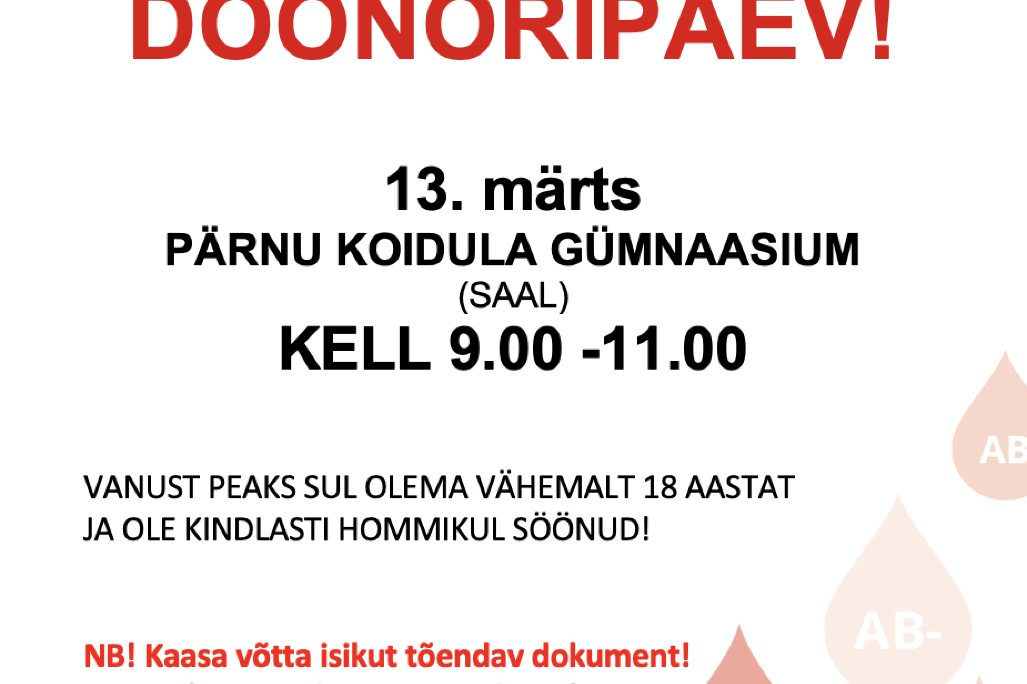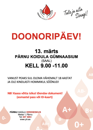 Verd saavad loovutada 18. aastased ja vanemad. Kaasa ID-kaart. Kindlasti söö hommikul!