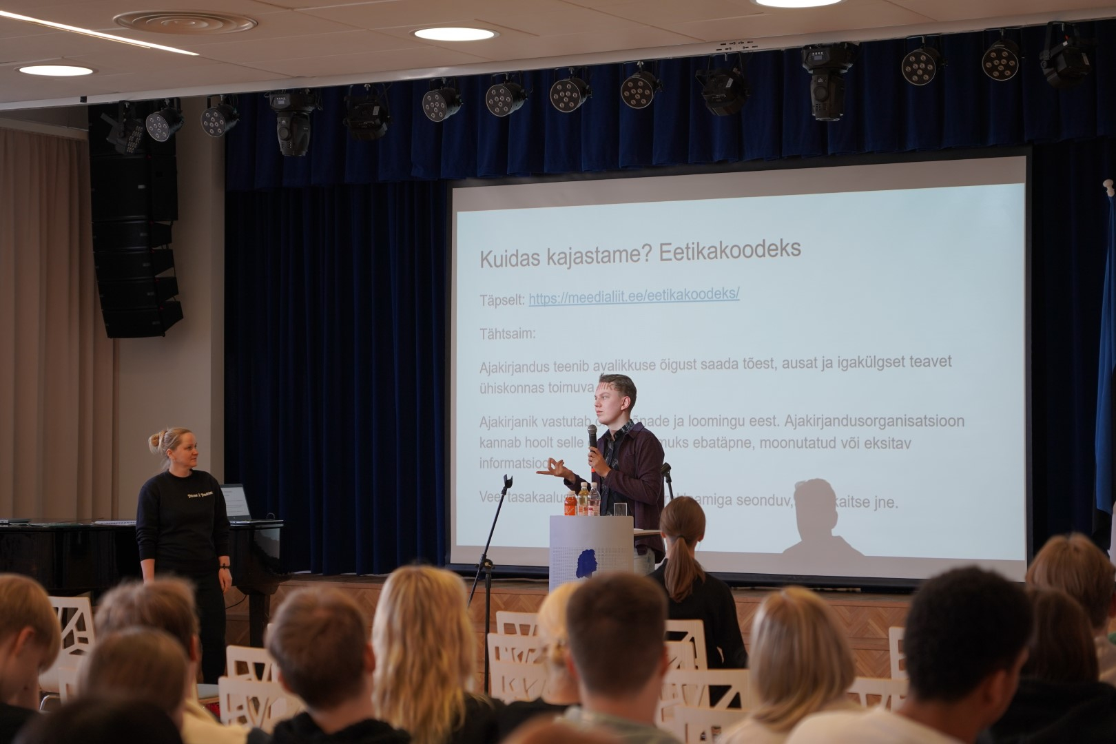 Siiri Erala ja Martin Laine rääkisid õpilastele koolidega seotud skandaalidest meedias, eetikakoodeksist ning mida ja kuidas kajastada.