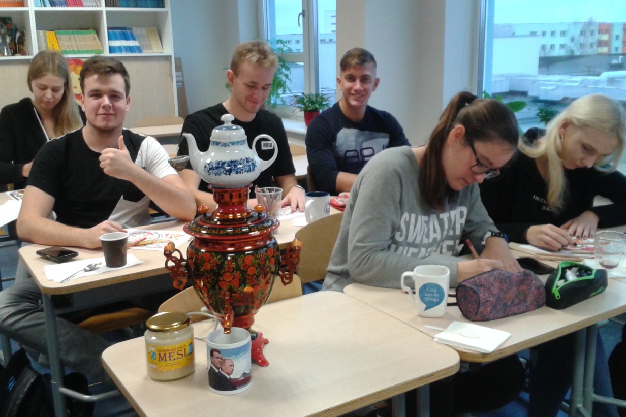 G3 klassid õpivad vene keeles sel õppeaastal Venemaa kultuurilugu. Tutvutakse suure naaberriigi geograafia, ajaloo, kunsti, kirjanduse, käsitöö ja palju muuga. Hetkel ongi jõutud käsitöönduse teemani. G3A klassi õpilased said teada, kuidas töötab samovar, milline on Matrjoška saamislugu, mis on gžel, hohloma, finift, kus ja kuidas valmistatakse imelisi laekaid jne. Pärast materjali selgekssaamist tegime teistmoodi tunni: nimelt oli palutud õpilastel kaasa võtta värvipliiatsid, millega hakati tunnis värvima hohloma mustrit. Oluline oli teada, milliseid värve ja kuidas kasutada. Kõrvale pakkus õpetaja teed, mida valmistati ehtsas vene samovaris. Juurde näksiti küpsiseid ja präänikuid. Handreas Hallimäe oli kaasa võtnud purgitäie imehead oma kodutalus valmistatud kreemjat mett, mis sobitus hästi teesse. Indrek Amoril oli aga tass, millel kujutatud Putin ja Medvedev. Tund kulges rahulikult ja mõnusalt. Ekraanil jooksis film Siberi taigast, selle loomadest, lindudest, taimedest.