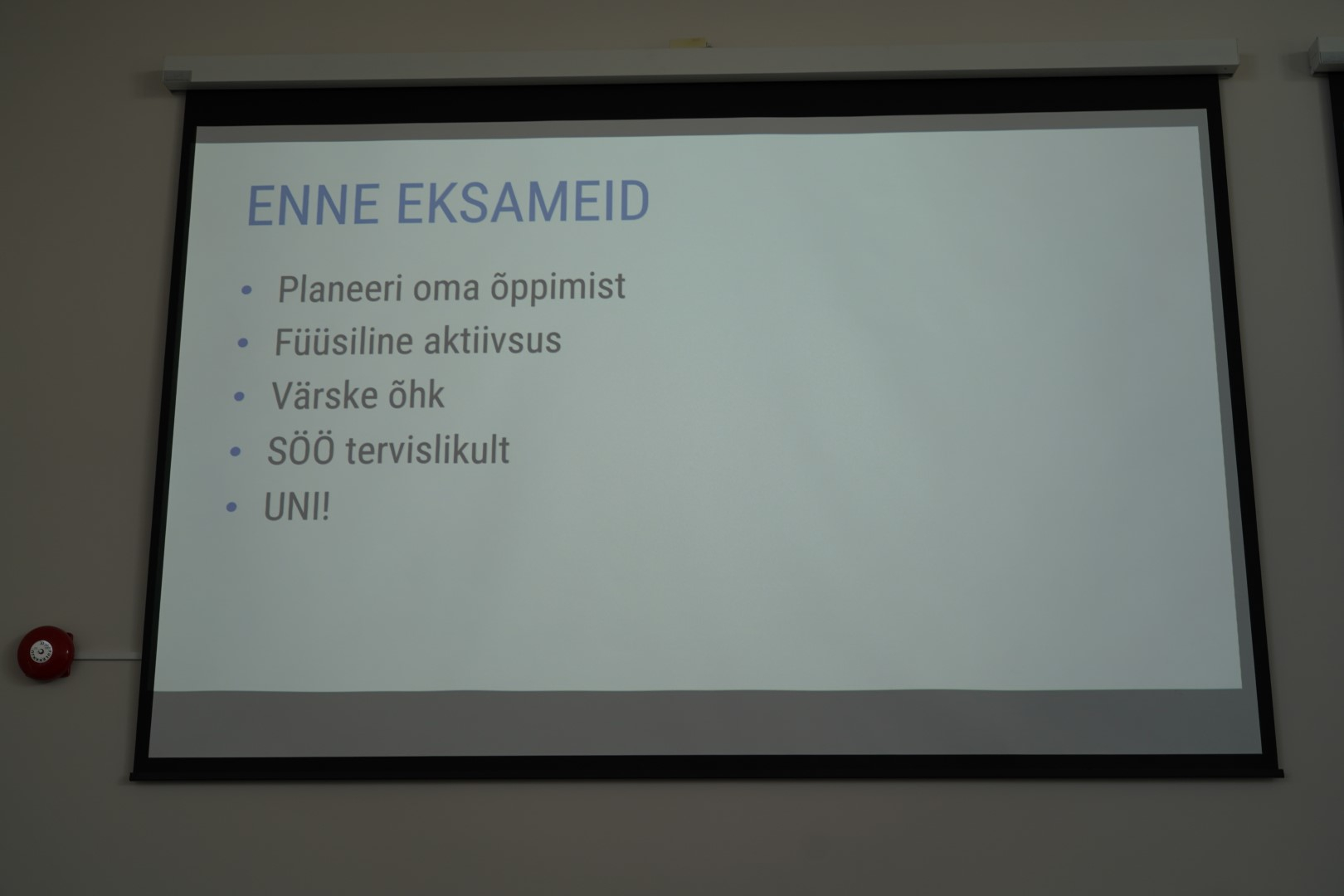 Kuidas enne saabuvaid eksameid eksamiärevusega toime tulla, sellest rääkis õpilastele psühholoog ning Koidula kooli vilistlane Tiina Kütt. Lisaks teada-tuntud nõuannetele andis Tiina Kütt näpunäiteid mitte nii levinud nippide kohta, mida õpilased võiksid enne eksamit kasutada.