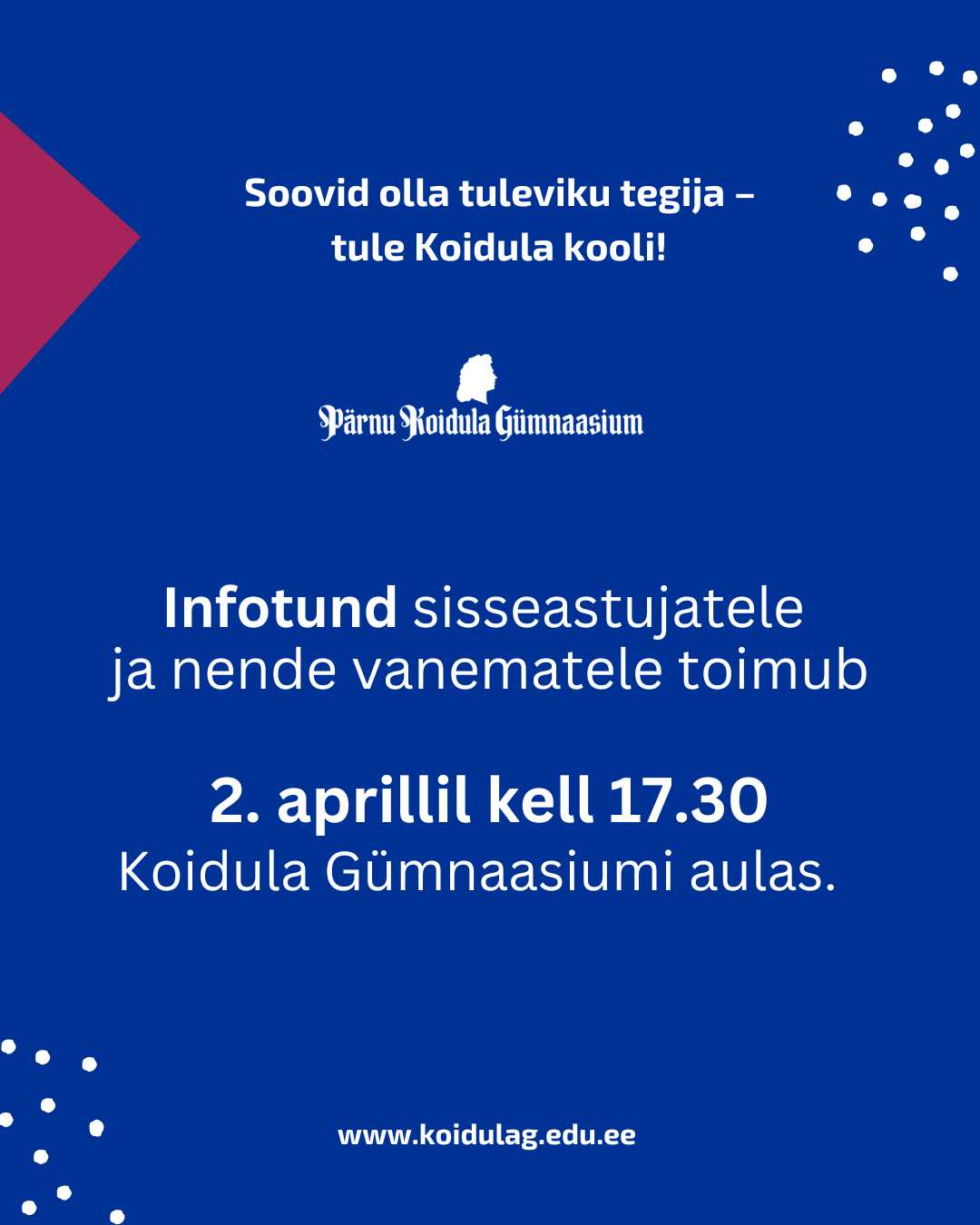 Neljapäeval, 02. aprillil toimub kooli aulas infotund sisseastujatele ja nende vanematele. Kõik on väga oodatud!