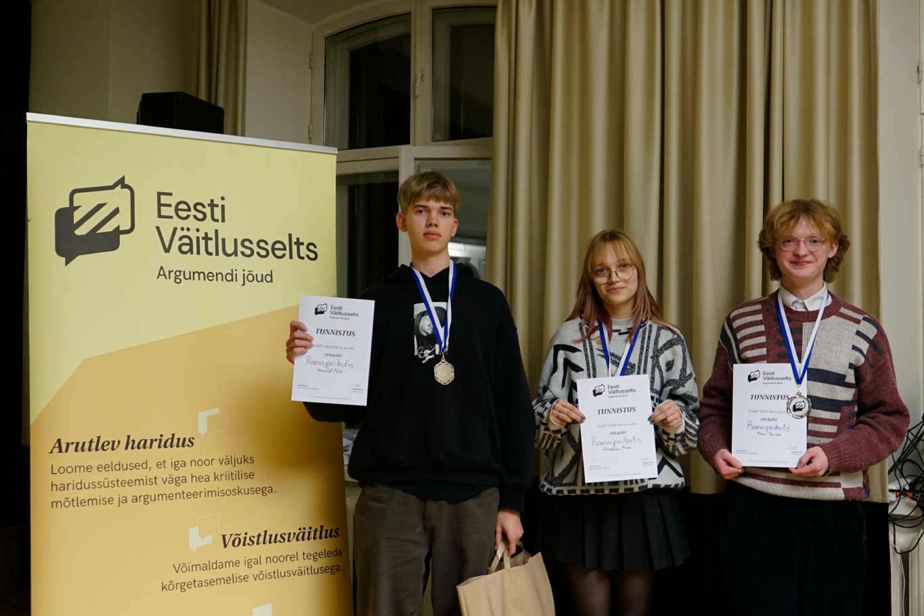 Laupäeval, 15. novembril toimunud algajate väitlusturniiri START sai meie G3 klassi võistkond koosseisus Annaliisa Aron, Taavi Saulep ja Harold Pulk 2. koha ja G1 klassi võistkond koosseisus Caroly Kopelmaa ja Triinu Nurm 3. koha.